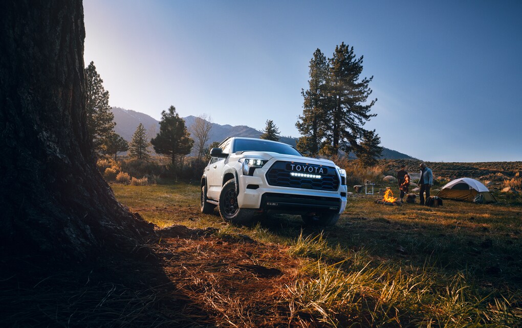 White Toyota Sequoia parked at a campsite
